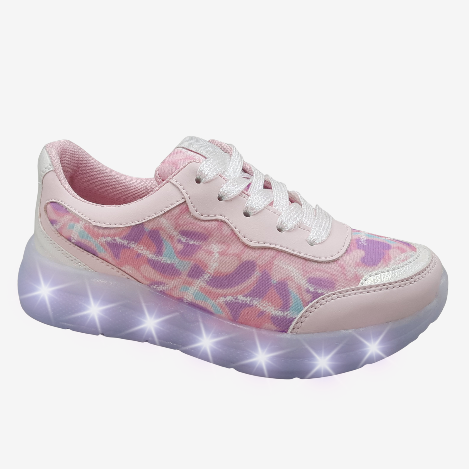 Tenis para niña color rosado / pastel, fabricados en sintético liso y malla textil. Forrados en su parte interna con textil suave de alta calidad y resistencia, cuentan con un sistema de fácil ajuste al pie del niño con correa - velcro - cordón elástico y suela cristal con luces.